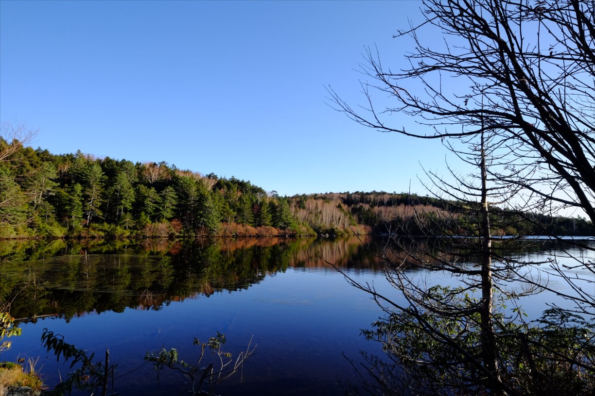 風が穏やかで、湖面に木が綺麗に反射しています。