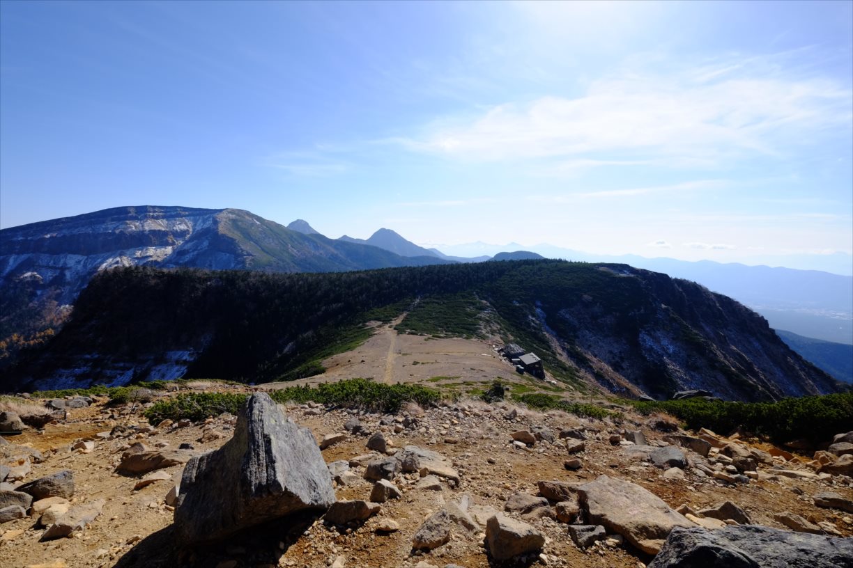 根石岳山荘から、来た道を眺める。