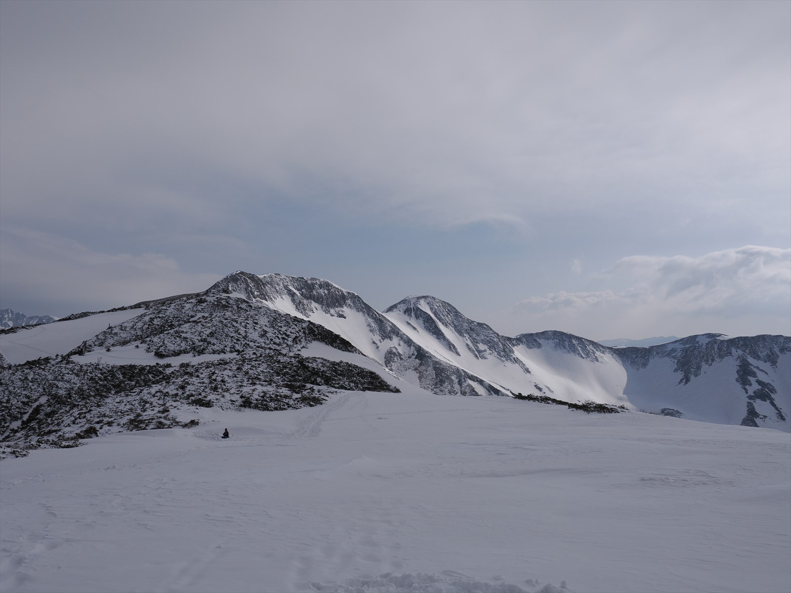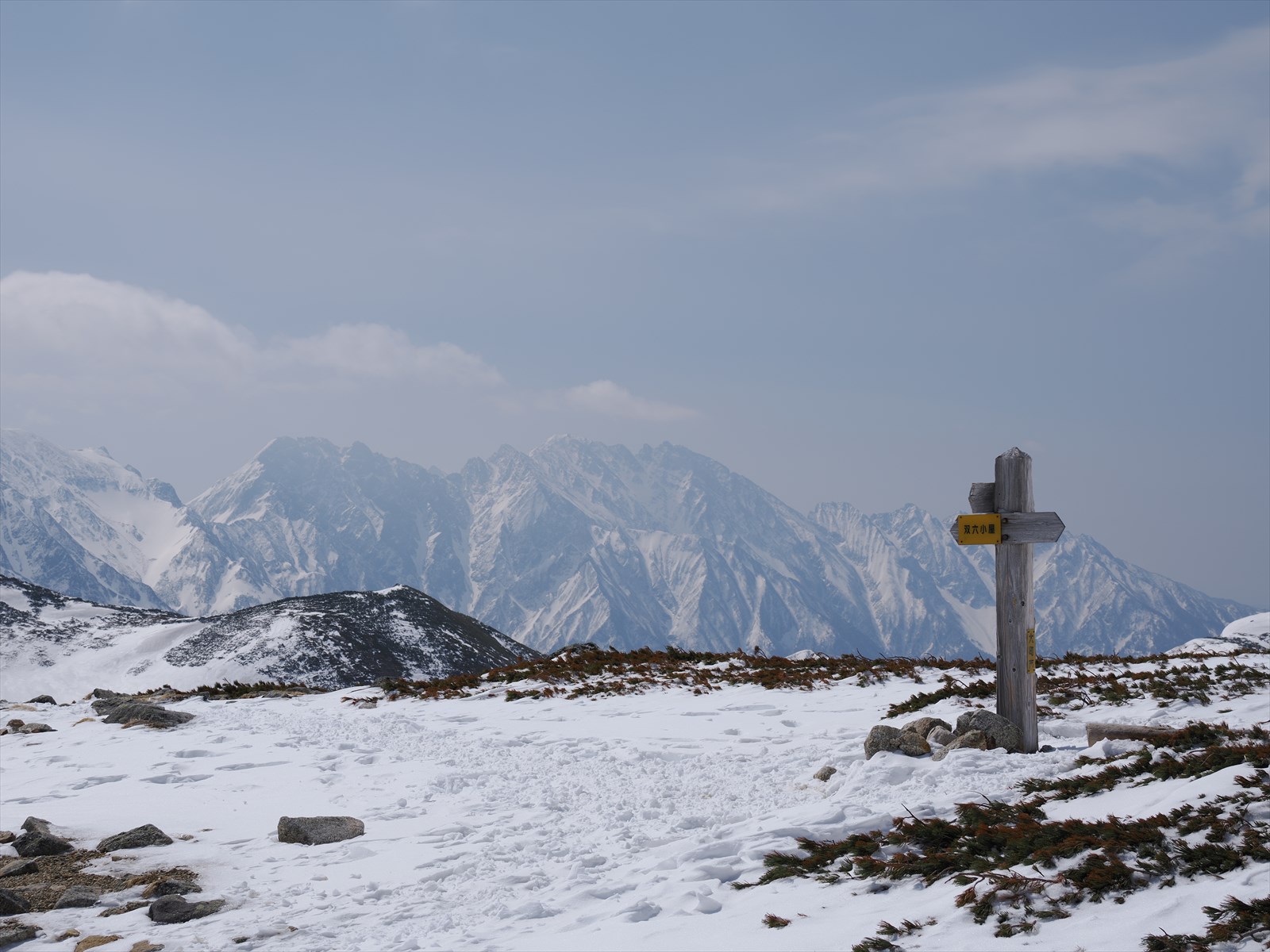 まずはなだらかな稜線を通り、冬季閉鎖中の双六小屋を目指します。