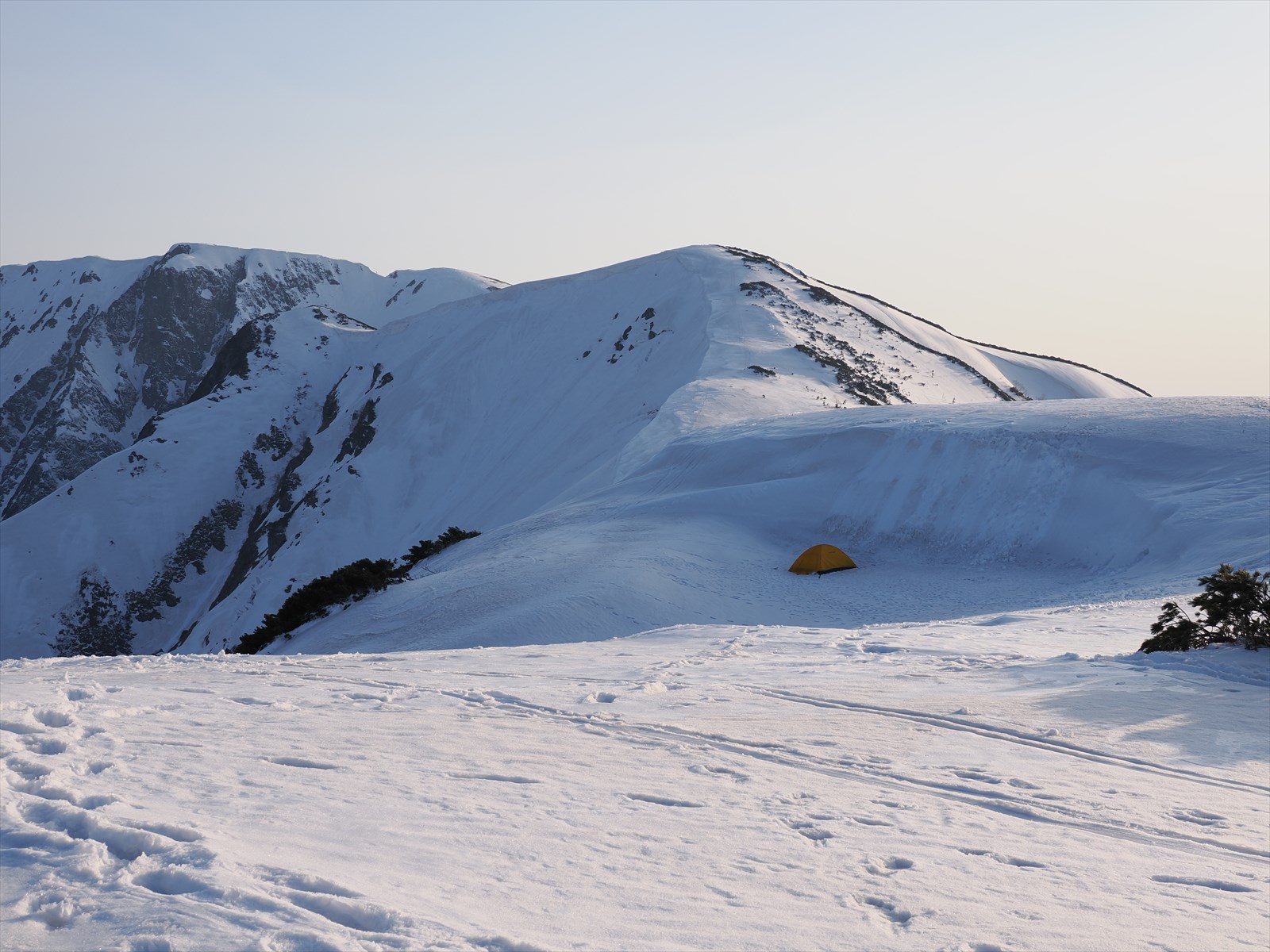 来た道を戻り、弓折岳近くのテント場へと引き返します。