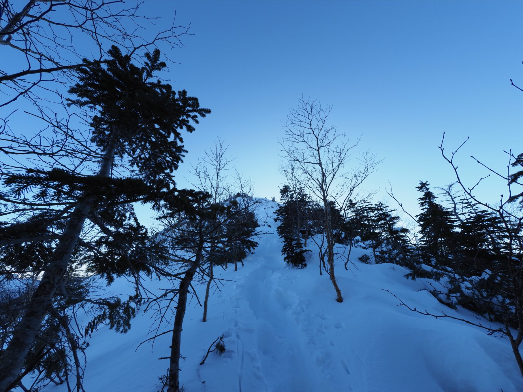 ちなみに、今回はトレースがバッチリついているため、ツボ足(ノーアイゼン)か軽アイゼンが登りやすいです。