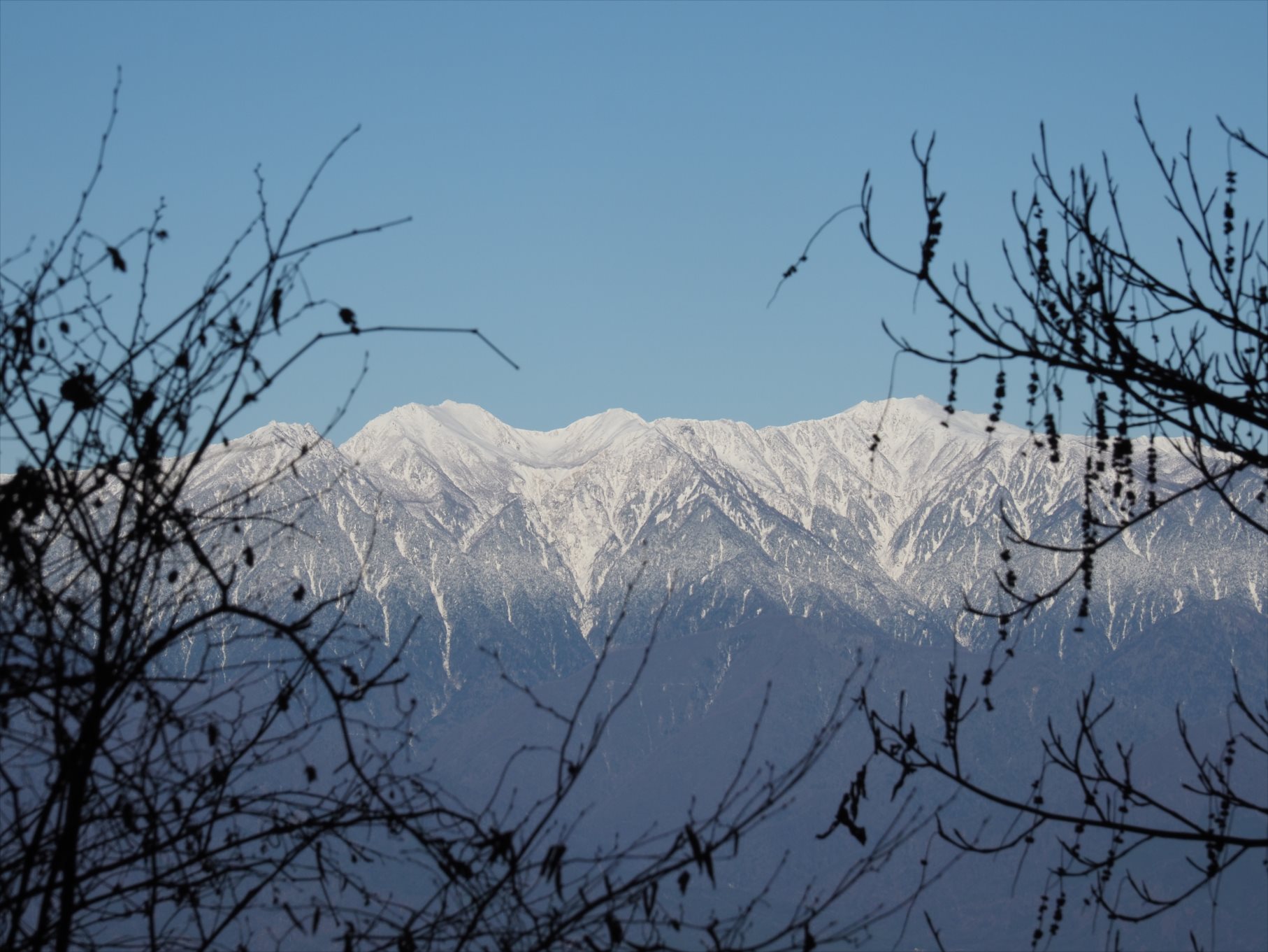 左の乗鞍岳から、右の後立山まで、北アルプス全域をバッチリ見渡すことができます。