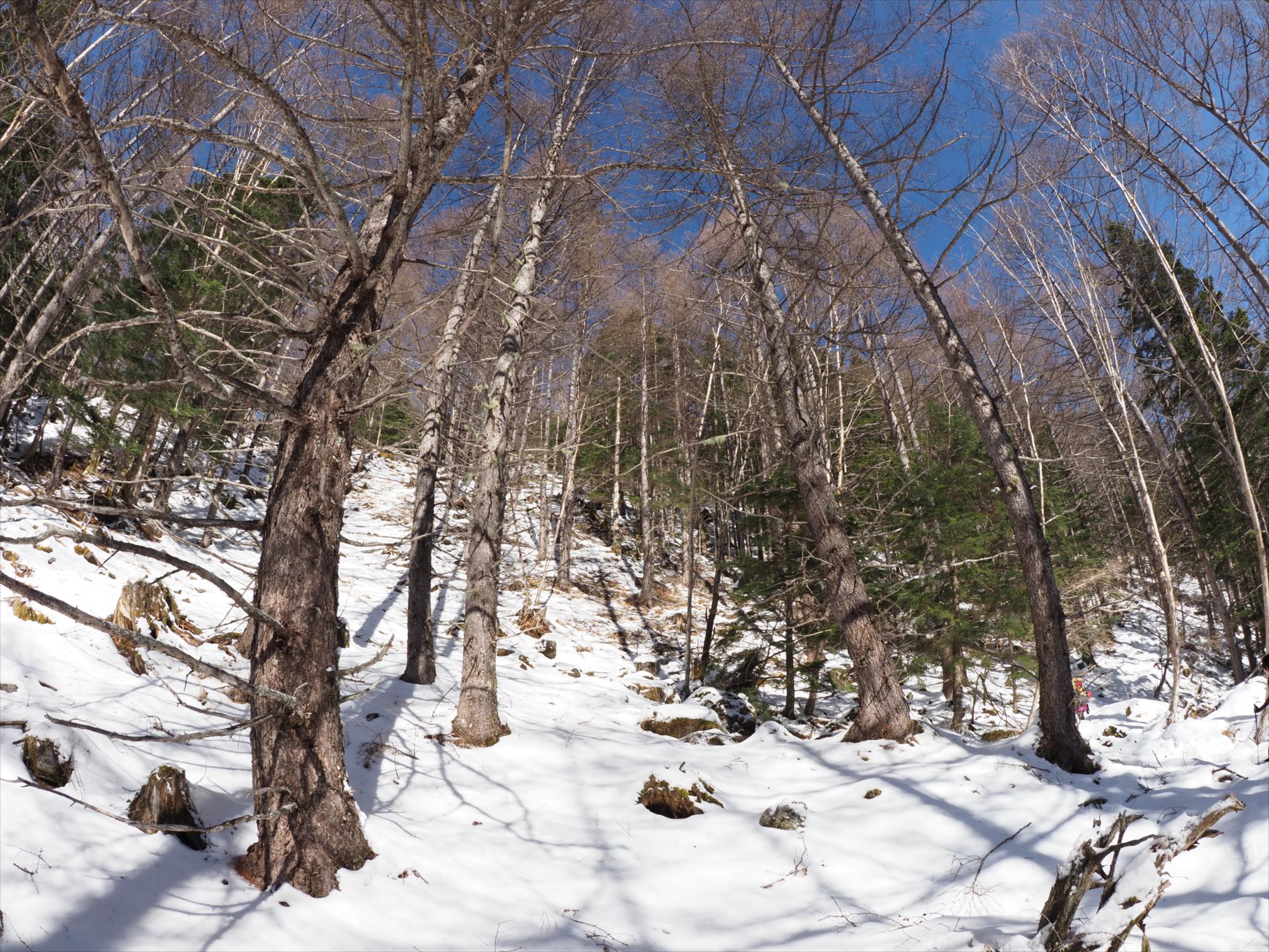雪は少ないので、ツボ足(ノーアイゼン)で登っていきます。