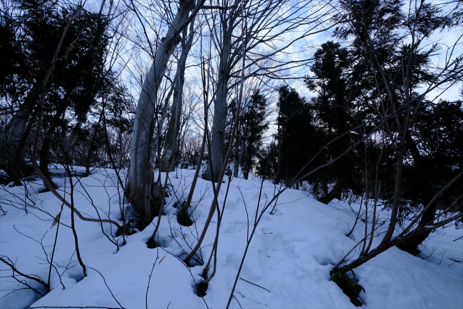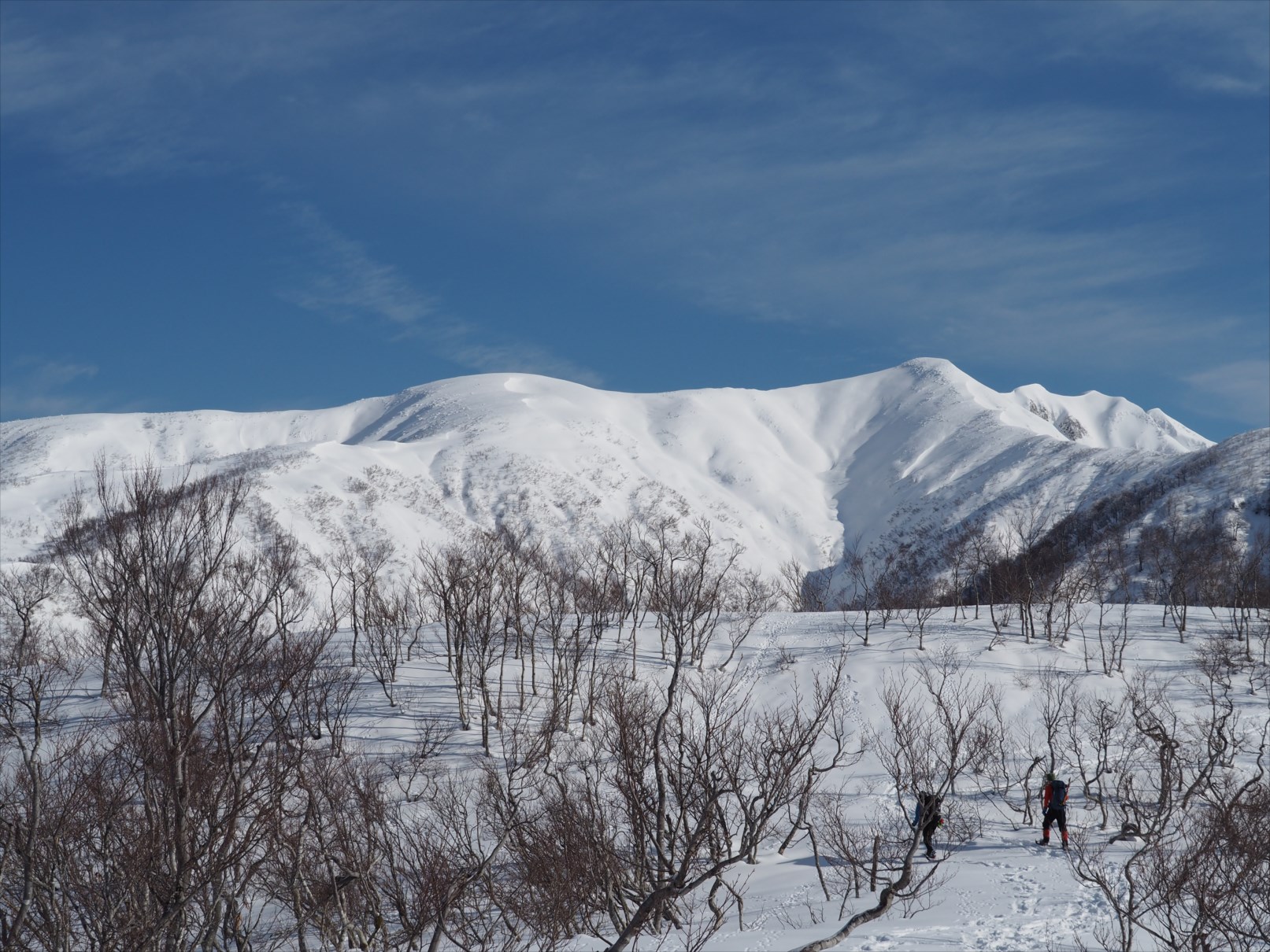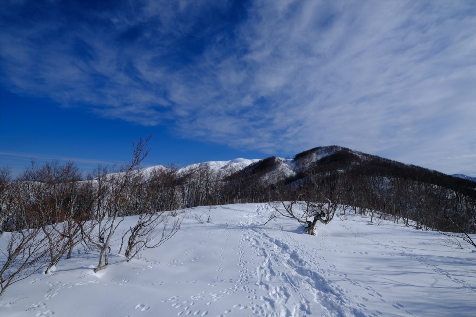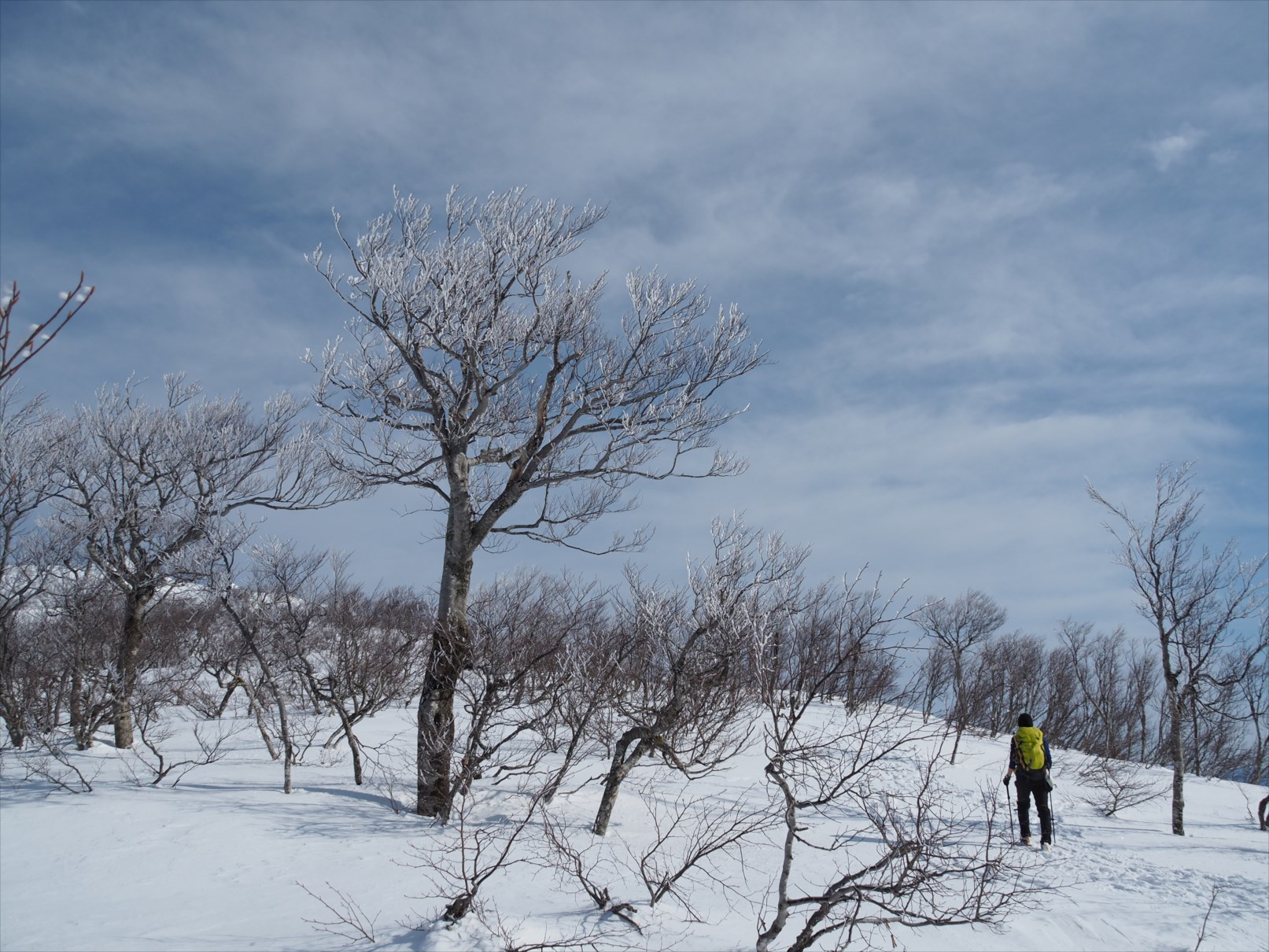 無雪期には単調な樹林帯かもしれませんが、雪山では枯れ木も美しい風景と化します。