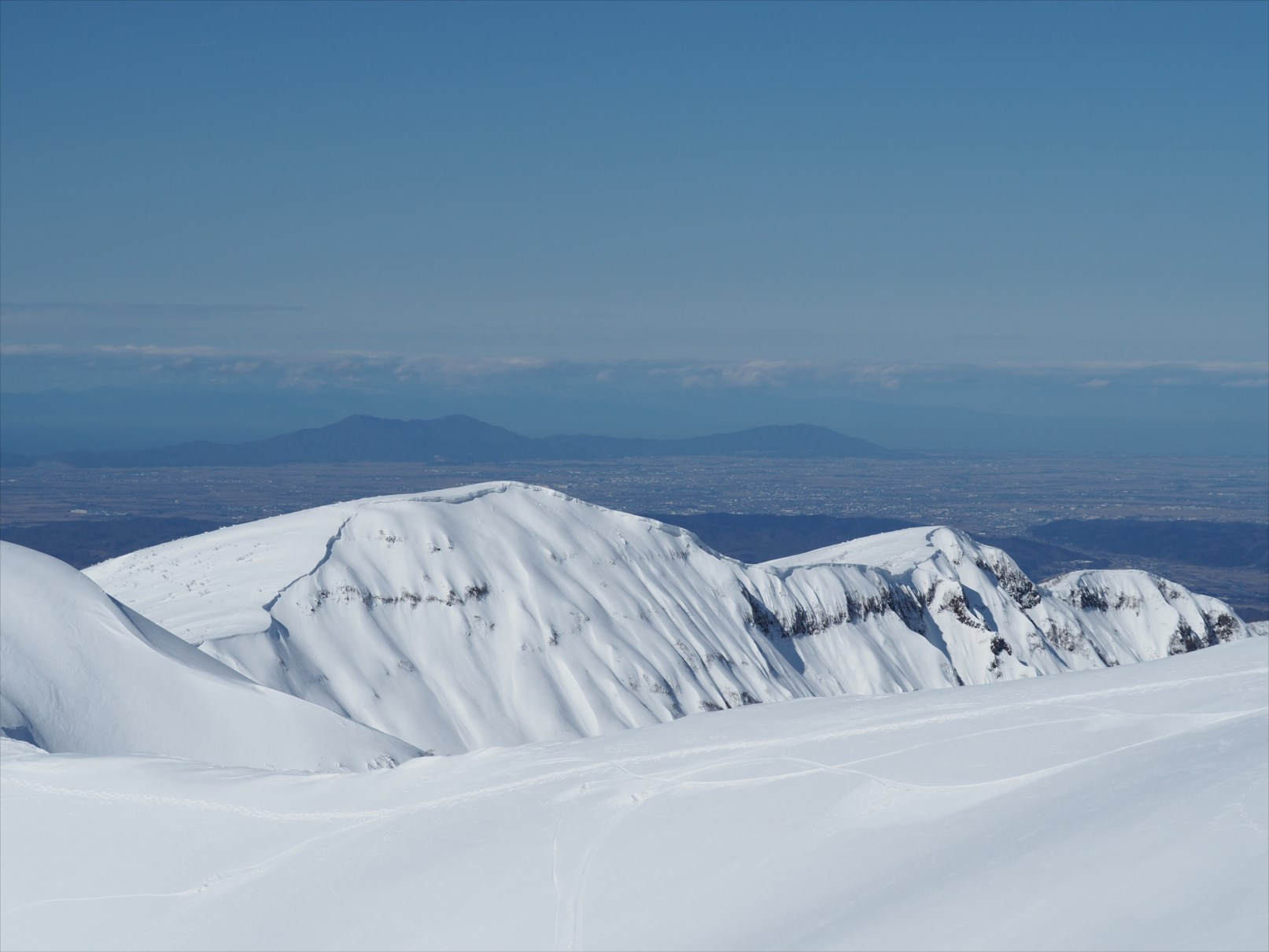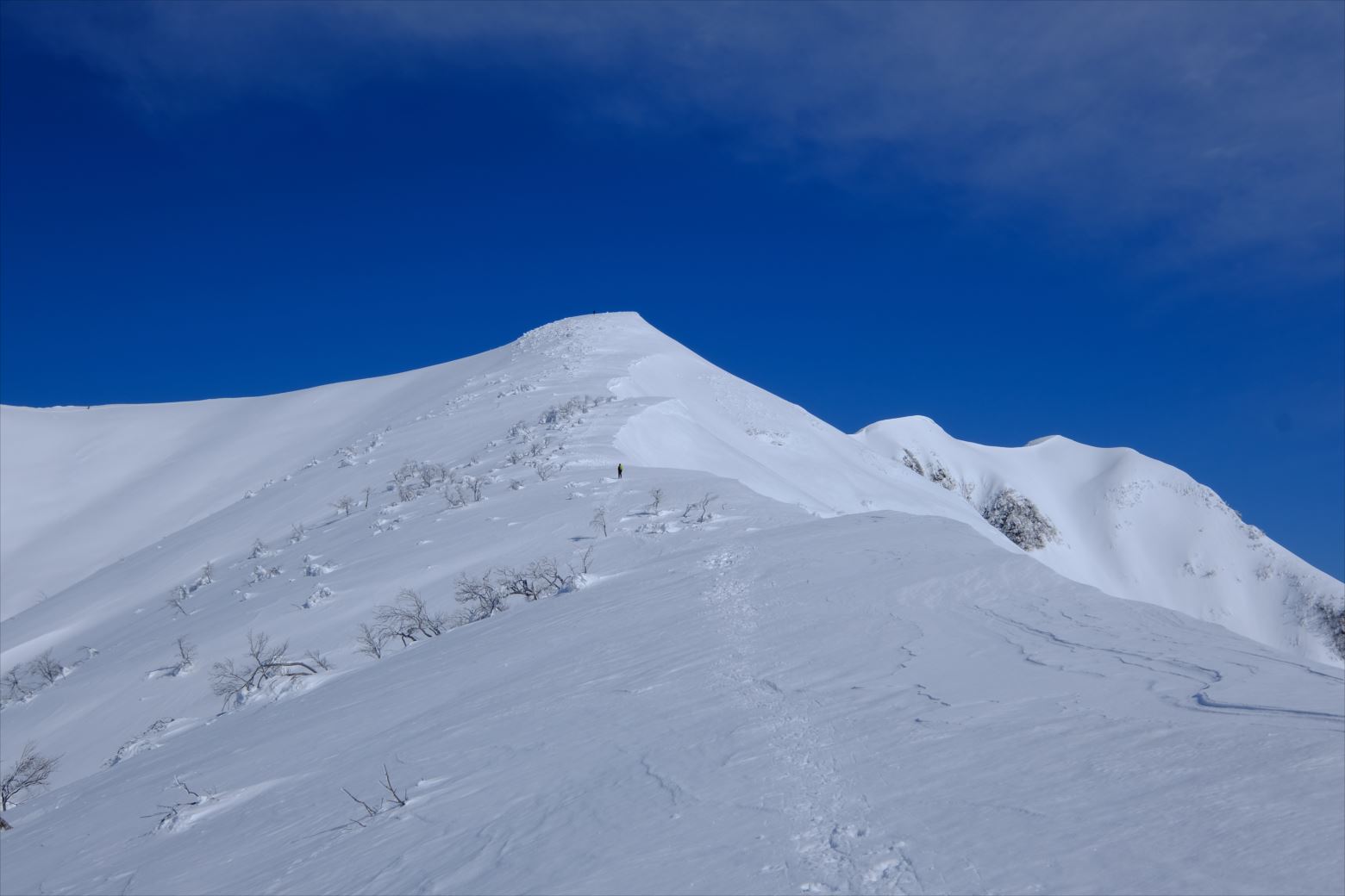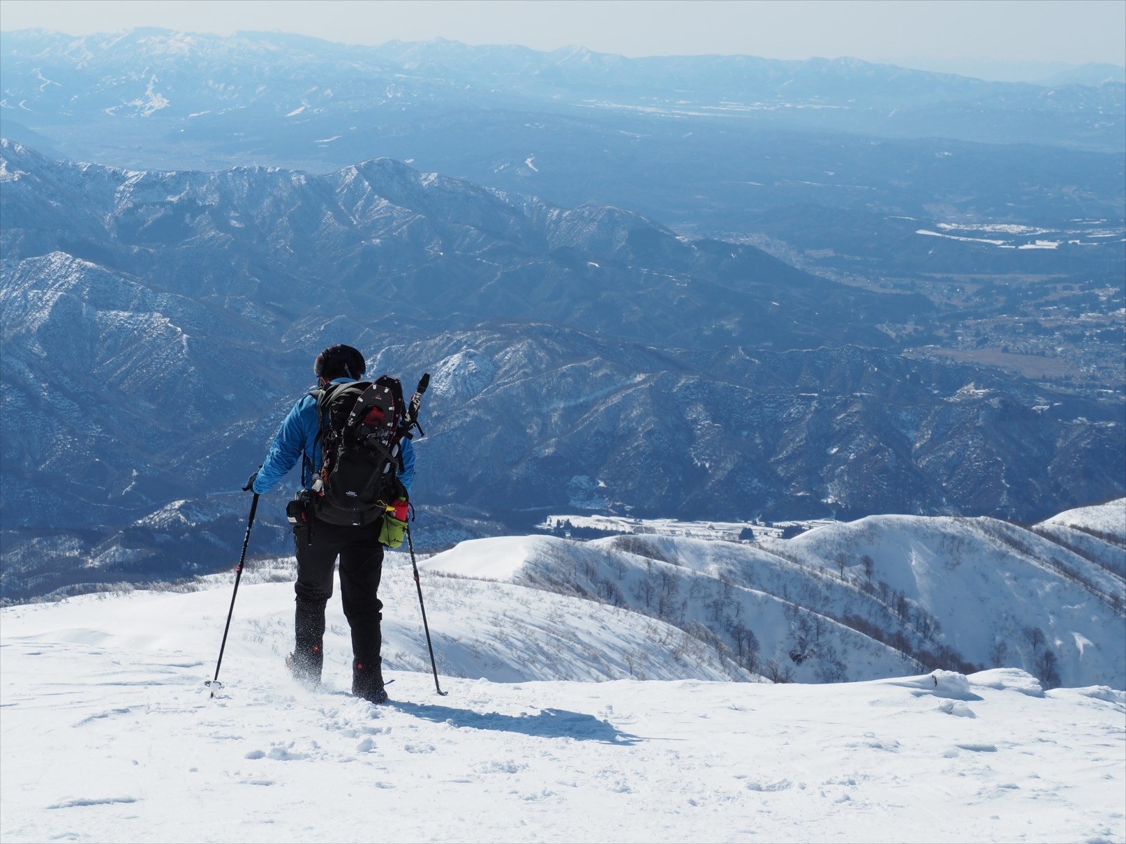 写真は、守門岳頂上からバックカントリーで下山する登山者。