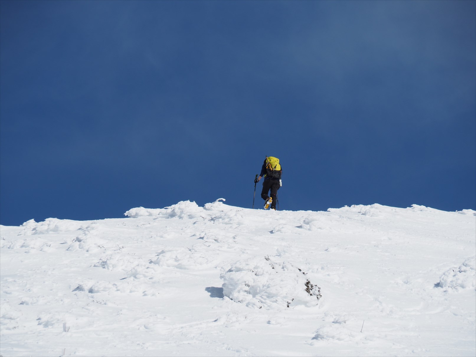 この日は山頂直下の斜面が一部固い急斜面となっているため、12本アイゼン+ピッケルを使うのが間違いありません。